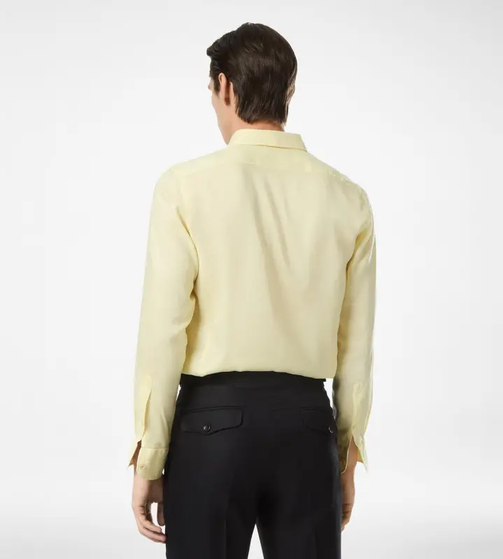 This shirt in fluid gabardine drapes is a slim fit that sculpts the body while preserving a flow, a study in balance between tailoring, sport and sensuality. Mother of Pearl buttons complete the piece.